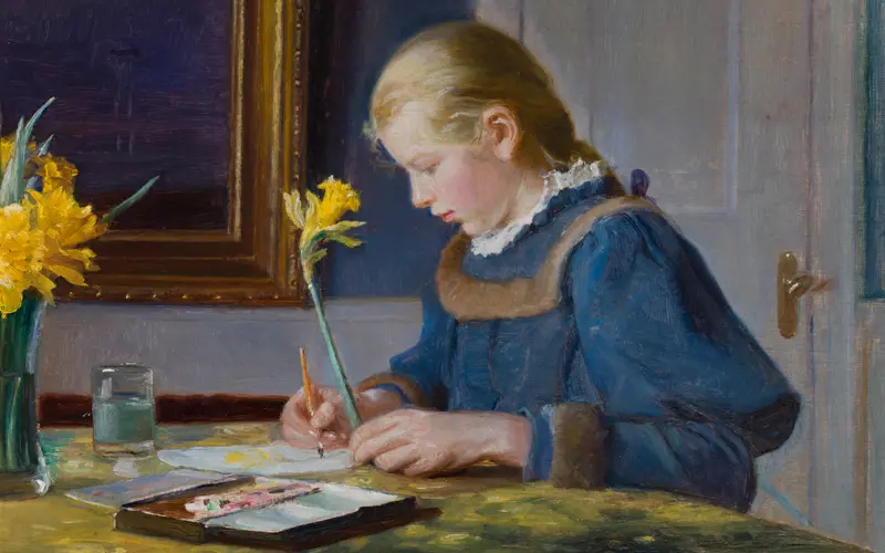 By Michael Ancher, Helga Ancher painting daffodils in watercolours, 1896. This painting is manipulated and belongs to The Art Museums of Skagen.