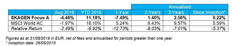 SKAGEN Focus A decreased 4.46% in August, underperforming the MSCI All Country World Index which fell 1.97%.