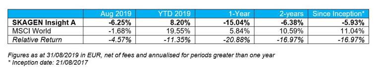SKAGEN Insight A declined 6.25% during August the quarter, underperforming the MSCI World Index which fell 1.68%.