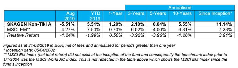 SKAGEN Kon-Tiki A fell 5.51% in August, underperforming the MSCI Emerging Markets Index which was down 4.27%.