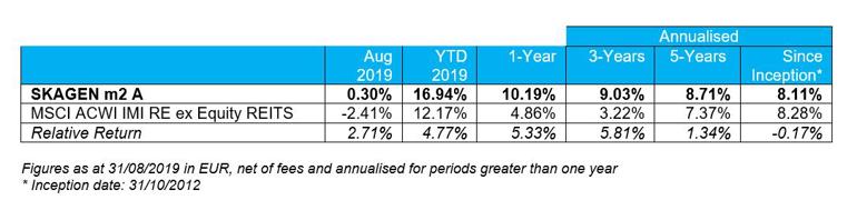 SKAGEN m2 A climbed 0.30% during August, outperforming the MSCI All Country World Index IMI Real Estate ex Equity REITS index which declined 2.41%.