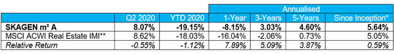 SKAGEN m² A climbed 8.07% during the quarter, underperforming the MSCI All Country World Index Real Estate IMI benchmark index which was up 8.62%.