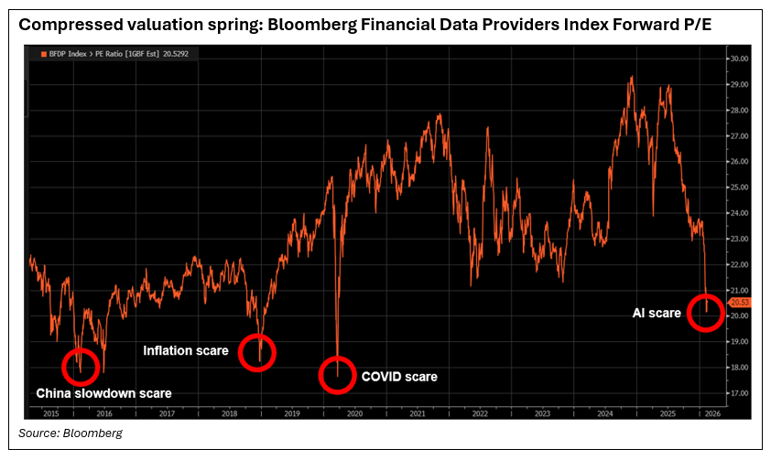 Software companies have recently suffered steep share price declines as investors have started to question whether businesses can substitute their products with in-house, AI-developed solutions (a trend commonly referred to as “vibe coding”). Many providers were under fire last year, but the AI race has seemingly accelerated in 2026 with greater agentic capabilities – such as those demonstrated by Anthropic’s Claude CoWork – triggering the ‘AI scare trade’ that has seen the S&P 500 Application Software Index fall 27% year-to-date[1].